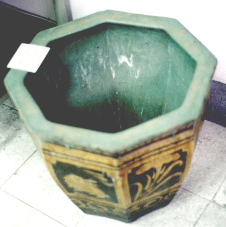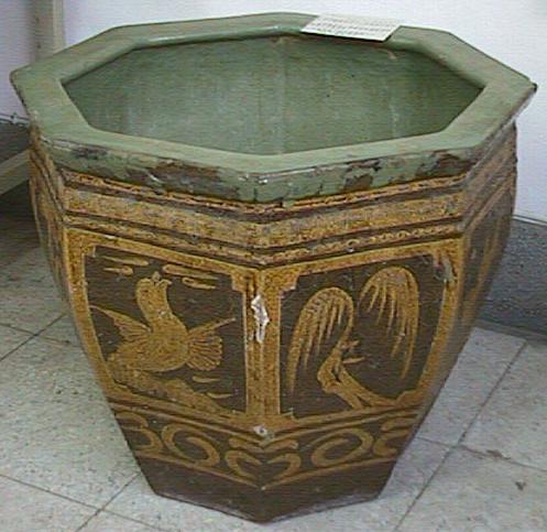 使用年代:民初迄今 台灣的古老屋子,存在許多以 手工用土窯燒的土器,是原始而簡 模生活中重要器具,缸就是其中之 一。 六角缸有大、小之分,不少是 由大陸船運來台,當時也是被做為 壓艙貨,其用途除了做為皮蛋缸外 ,亦可用來養金魚。 外表所使用是加繪黃褐色釉, 色彩相當亮麗,造型亦優美。 (家長林麗華提供)