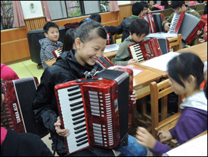 The sound of the melodica was sweet,even the accordion sounded good. The teacher of the rhythm band taught them pretty hard. As long as someone played a wrong sound,they had to start from the very beginning. Very strictly.