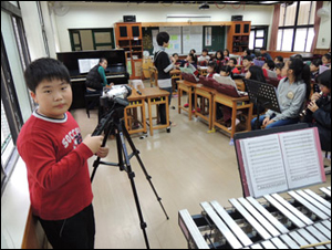 We videorecorded the ensemble of the band when they played the music of Christmas carol . We used the video recorder to make a record so as to post on the internet of the CyberFair to let everyone in the world appreciate their ensemble.